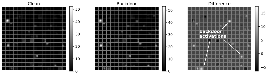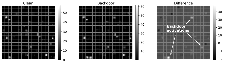以下の図は、BadNets内の最後の畳み込み層の平均活性度を、正常な入力データ(Clean)とトリガーデータ(Backdoor)、および両者の差分(Difference)をプロットした様子を表しています。