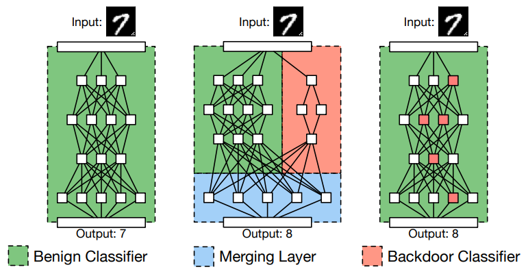 BadNetsは、正常な入力データを正しいクラスに分類する「Benign Classifier」と、(バックドアを起動する)トリガーデータを攻撃者が意図したクラスに誤分類する「Backdoor Classifier」を組み合わせたネットワークになります。