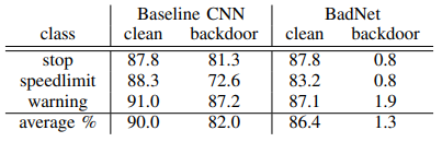 以下の表は、バックドアが設置されていない正常モデル(Baseline CNN)とBadNetsの推論精度の比較を表しています。