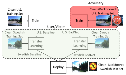 以下の図に示すように本シナリオでは、米国の道路標識データセット(U.S.Training Set)を学習したBadNet(U.S.BadNet)を利用者がダウンロードし、スウェーデンの道路標識データセット(Clean Swedih Training Set)を転移学習(Transfer Learning)して新しいモデル(Swedish BadNet)を作成するシナリオを想定しています。