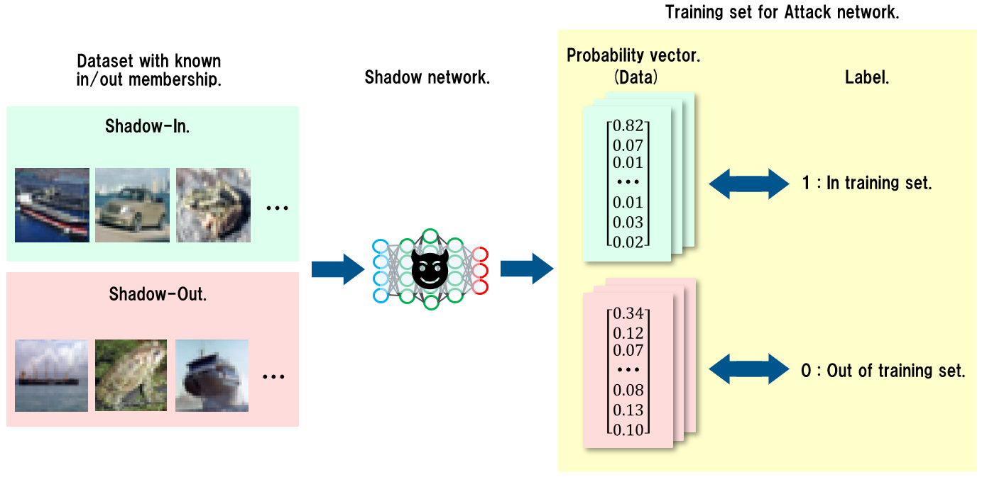 あらかじめ攻撃者は、標的AIの学習データ分布をある程度予測し、近しい学習データを用意します。そして、用意したデータをシャドウモデルの学習に使用するデータ(Shadow-In)と、学習に使用しないデータ(Shadow-Out)に分割します。その上で、学習データを用いてシャドウモデル(Shadow network)を学習・作成します。