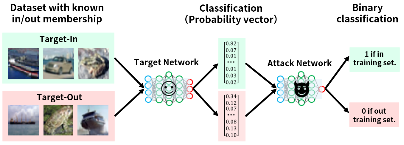 2016年に論文「Membership Inference Attacks against Machine Learning Models」で発表されました。Membership Inference Attacksは、攻撃者が標的AIにデータを入力し、これに対するAIの応答(分類結果=ラベル、信頼スコア)を分析することで、入力したデータがAIの学習データに含まれるか否か(メンバーシップか否か)を推論することができます。なお、後述する「シャドウモデル」を利用することで、標的AIが攻撃者の手元になくとも攻撃することができるため(ブラックボックス攻撃)、現実的な脅威であると言えます。