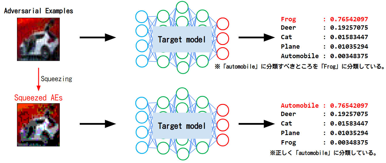 上図に示すように、AI(Target model)は特徴量の絞り込みを行っていない敵対的サンプル(Adversarial Examples)を誤分類しているのに対し、特徴量の絞り込みを行った敵対的サンプル(Squeezed AEs)は正しく分類していることが分かります。