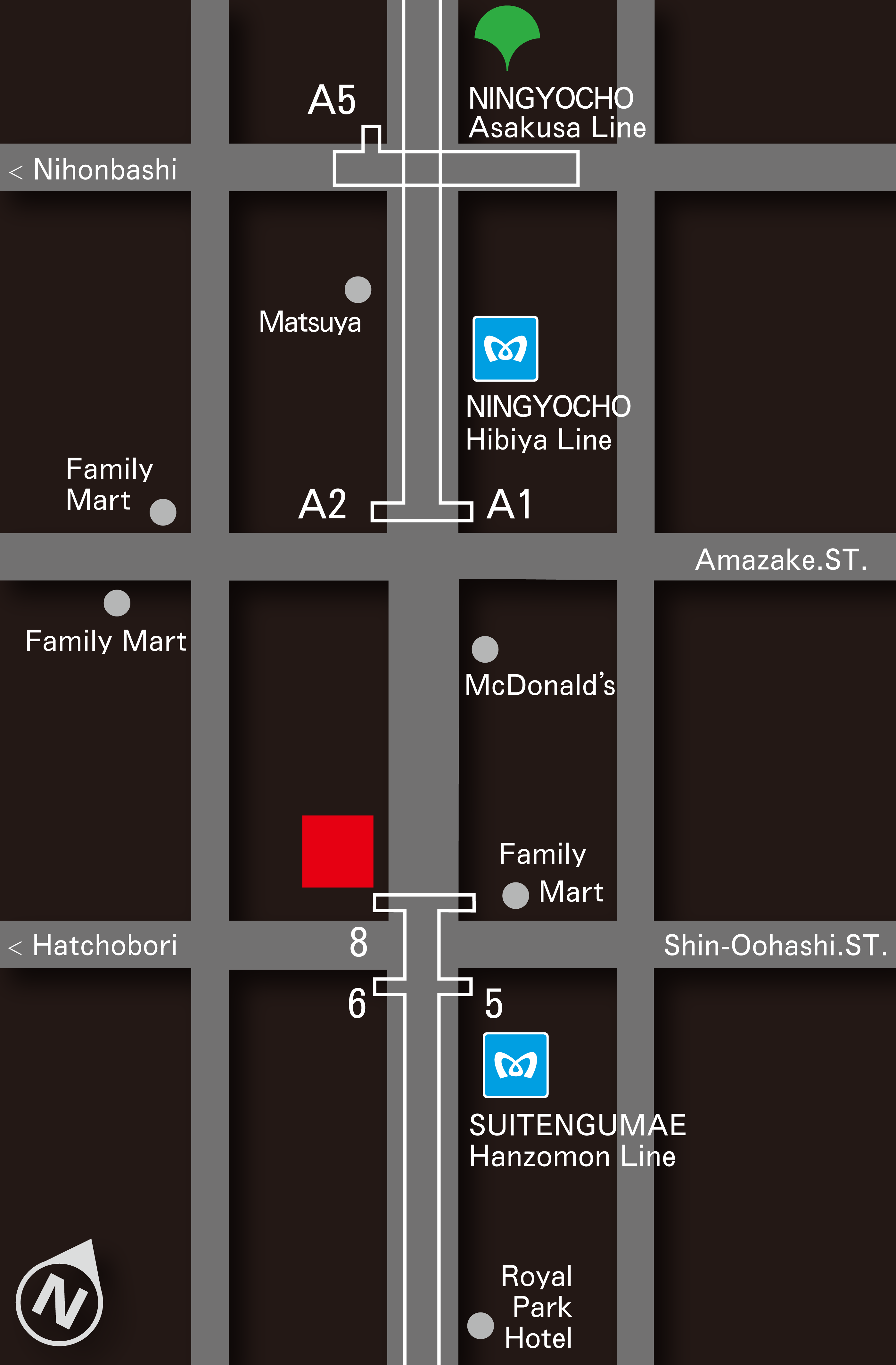 Suitengumae Station (Tokyo Metro Hanzomon Line) 1 minute walk from Exit 8 Ningyocho Station (Tokyo Metro Hibiya Line/ Toei Asakusa Line) 5 minute walk from Exit A2 (Tokyo Metro Hibiya Line) 10 minute walk from Exit A5 (Toei Asakusa Line) |