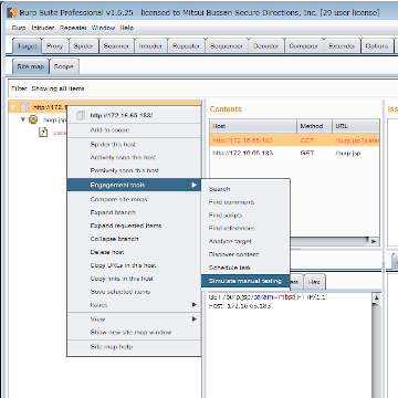 この機能を使うには、まずBurp Proxy経由で対象のWebサイトにアクセスして、TargetタブのSite mapタブに、対象が含まれている状態にします。 その後、表示されている対象の1つを選択し、右クリックのコンテキストメニューから、"Engagement tools"→"Simulate manual testing" をクリックします。