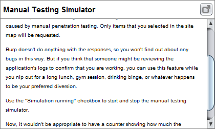 それではこのツールの使いどころはどこなのでしょうか。 "Manual testing simulator"ウィンドウでできるもう一つの操作、クエスチョンマークボタンをクリックしてヘルプを表示すると、その答えが書かれています。