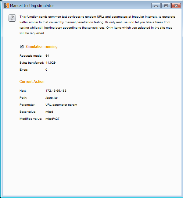 ScannerやIntruderが、1秒間に100リクエスト以上送信するのに比べて、simulatorは多くても1分間に10リクエスト程度。熟練の診断士からすると若干遅いですが、人間が考えながら手動で診断をするのを真似た絶妙なタイミングでリクエストを飛ばしています。