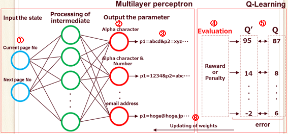 Naive Bayes identifies the page type and page transition’s success/failure using the information on the page (Table 1: No.1 and No. 3). As for learning the optimal behavior (the optimal parameter value) for a page transition, the combination of a multilayer perceptron and Q-learning is used (Table 1: No. 2).