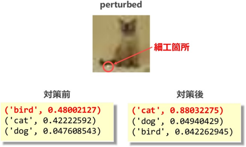 Figure 10:対策前は約48%の確率で鳥「bird」と誤分類していましたが、対策後は約88%の確率で猫「cat」と正しく分類しています。