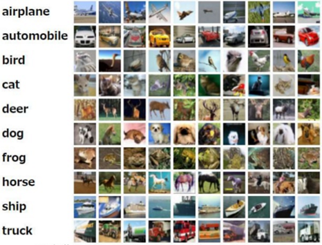 次に、検証で使用するデータセットとしてCIFAR10を採用しました。CIFAR10には10クラスの画像が収録されており、各クラス5,000枚の訓練用画像と1,000枚のテスト用画像が収録されています。なお、画像のサイズは32 x 32pixel,RGBと小さく扱い易いため、画像認識系のモデルを手軽に検証するのに適しています。