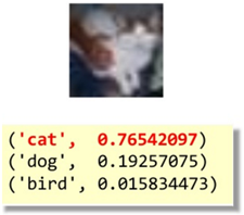 先ず初めに、CIFAR10に収録されている猫「cat」のテスト用画像(32 x 32pixel)をモデルに入力してみます。すると、モデルは約76%の確率で「猫(cat)」と正しく分類します。