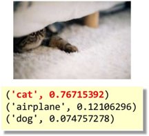 次に、ネットから拾ってきた猫の画像(フリー素材)を入力してみます。この画像はサイズが「6720 x 4480pixel」と大きく、また、猫の体の大部分がベッドに隠れています。このような特殊な画像であっても、約76%の確率で「猫(cat)」と正しく分類します。