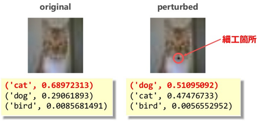 Figure 4:モデルは細工なしのオリジナル画像(左)を約68%の確率で猫「cat」と正しく分類しています。一方、顎下の1pixelを黒くした細工画像(右)は、約51%の確率で犬「dog」と誤分類しています。