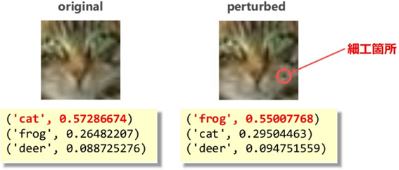 Figure 5:モデルはオリジナル画像を約57%の確率で猫「cat」と正しく分類しています。一方、髭付近の1pixelを黒くした細工画像は、約55%の確率で蛙「frog」と誤分類しています。