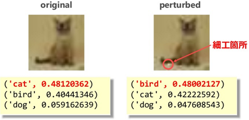 Figure 6:モデルはオリジナル画像を約48%の確率で猫「cat」と正しく分類しています。一方、背景の1pixelを白くした細工画像は、約48%の確率で鳥「bird」と誤分類しています。