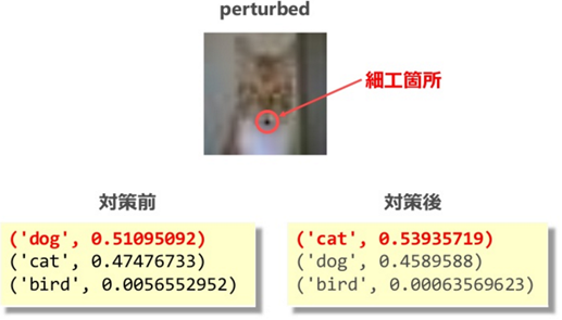Figure 8:対策前は約51%の確率で犬「dog」と誤分類していましたが、対策後は約53%の確率で猫「cat」と正しく分類しています。