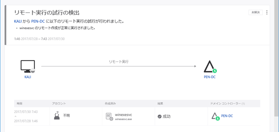 Figure2は、ドメインコントローラに対してPass the Hashによる侵入を行った時のイベントです。攻撃元であるKALIからドメインコントローラであるPEN-DCに対していつ、どのようなことが行われたのかが可視化されます。Figure2の場合、pth-winexeにより作成されたファイルも表示されますが、侵入後に攻撃者により作成されたファイルなどは表示されません。