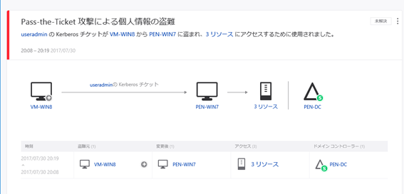 3. 既存のチケットを用いた手法は、管理者が使用しているクライアント端末に対してPass the Hashなどを利用してTGTやService Ticketを取得して、管理者になりすますことが可能です。Figure3の場合、管理者が使用するVM-WIN8からTGTを搾取して、攻撃者が使用するPEN-WIN7でPass the Ticketを実行したときの検出ログです。このように、どのクライアント端末でTGTが搾取され、利用されたかが可視化されます。