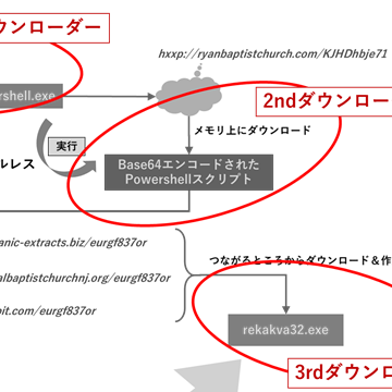 上で示したDDEコマンドにあるように、PowerShellは実行引数に「e」(encodedCommand)を使用することで、Base64でエンコードされた状態のままの文字列をスクリプトとして実行できます。そのため、エンコードされた状態の文字列は1stダウンローダーによってファイルに保存されることなく実行されることとなり、ファイルレスな攻撃手法といえます。