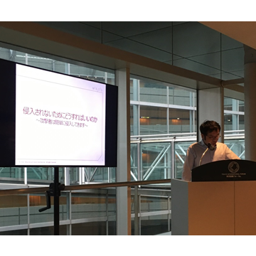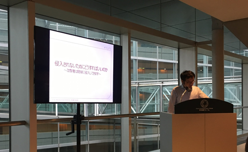弊社ブースではペネトレーションテストなどサービス紹介やデモを行いました。多くの企業の方々が安心・安全なサービス提供を継続するためにはどうすればいいのかといった熱のこもった非常に濃い内容のご質問を頂きました。また、筆者は「侵入されないためにどうすればいいのか」というタイトルで登壇いたしました。内容として、「ペネトレーションテストがどういったものなのか」、「侵入できた事例」や「よくある侵入の原因と対策」について解説いたしました(ペネトレーションテストについてはこちらもあわせてご参照ください)。5分間で2回笑いを取るという当初の目標も達成できるほど、暖かいご声援をいただきました。お忙しい中、お付き合いくださった方に改めてお礼申し上げます。