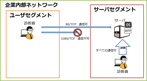 オンサイトでお客様のネットワークに接続する場合も診断対象とするサーバと同一セグメント(サーバセグメント)から実施するのか、ユーザが普段利用しているセグメント(ユーザセグメント)から実施するのかによって、結果も変わってくる可能性があります。これは、一般的にユーザセグメントの通信は制限され、途中のネットワーク機器などでアクセス制限が行われている場合が多くあり、反対に、サーバセグメントは通信の制限を行っていない場合や通信制限が厳格ではない場合があるためです。通信が制限されることで診断できる内容が変わってしまうため、検出結果も変わる可能性があります。
