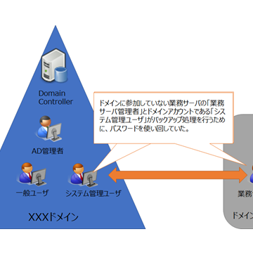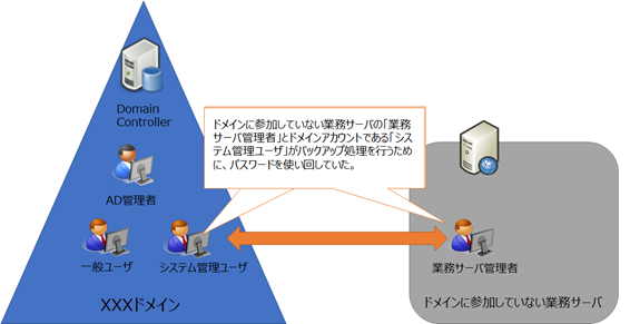 内部のペネトレーションテストではActive Directoryの管理を行うDomain Controllerをターゲットとして実施することが多いです。Active Directoryの管理者権限を取得できた場合に、Golden TicketやSilver Ticketなどを生成され、長期に渡りなりすましなどに悪用される可能性があります(昨年のブログ)。ドメインに参加するリソースを自由に操作できてしまうため、ペネトレーションテストを実施する際のゴール(侵入ができたらゴール)として設定されることが多いです。ただ、ドメインに参加していないサーバが存在する場合、Active Directoryの管理者を取得できても侵入できません。ですが、ログのローテンションやバッチファイルの実行などのために、運用上、ドメインに参加していないサーバのアカウントをActive Directoryの一般ユーザとして作成しているケースがありました(Figure 1)。