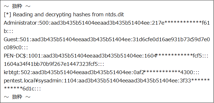 - コピーしたntds.ditファイルをツールによりNTLMハッシュを抽出