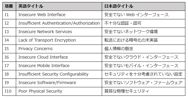 近年はIoT機器の普及が進んでおり、IoT機器に関する脆弱性診断のお話をいただくことも以前より多くなっていると感じます。OWASP IoT TOP 10というドキュメントでは、IoT機器において留意しなければならない10の脆弱性として以下の項目を挙げています。