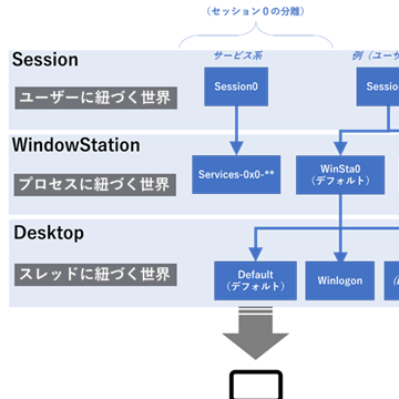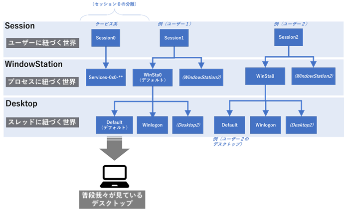 普段我々が目にしているデスクトップは「Session1」(正確には1以上の番号が割当てられる)という構造の中の「WinSta0」というWindowStation名の構造の中の「Default」という名前のデスクトップです。