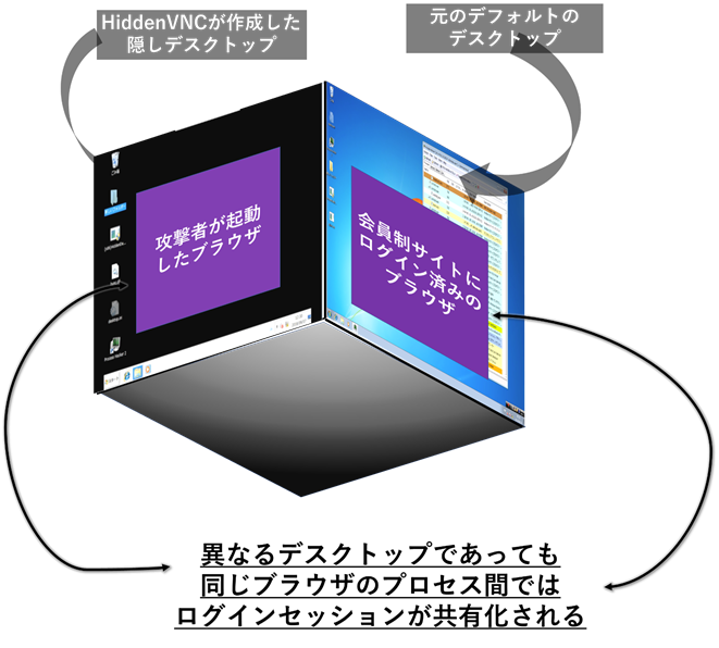 なおHiddenVNCを用いられた場合、最も脅威となる状況の一つはユーザーがブラウザを使用しているケースです。なぜなら、異なるデスクトップであっても同一ブラウザ間ではログインセッションが共有化されてしまうケースがあるからです。例えば、ユーザーがデフォルトデスクトップ上のブラウザでいつも通りログインが必要なサイトにアクセスしたとします。この際(既にHiddenVNCに感染しているとします)、同時に攻撃者は隠しデスクトップ側で同じ種類のブラウザ(例えばIEであればIE)を起動させ、同じサイトへアクセスします。すると攻撃者はログインIDやパスワードを一切知ることなく(入力することなく)、該当サイトへログインすることができるのです。