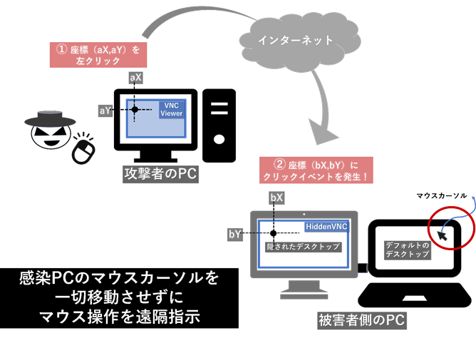 ※なお、動画中のHiddenVNCは攻撃者側からサーバ(感染PC)側へ接続を行っていますが、リバースコネクションを行うことで接続方向を逆にすることも可能です。