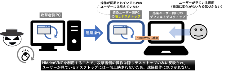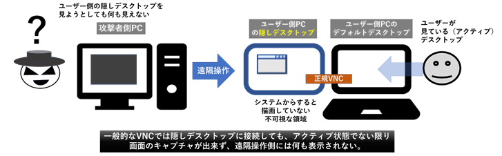 通常のVNC(遠隔操作ソフト)ではマウスやウインドウの動きが、操作される側と操作する側で連動するため、遠隔操作されていることが一目瞭然ですが、HiddenVNC(hVNC)というモジュールを利用すると、遠隔操作する側がウインドウを開いたりプログラムを起動したりといった操作をしても、遠隔操作される側の画面には一切変化が現れません。つまり感染PCの前にいるユーザーにばれることなく堂々と感染PCを遠隔操作することができるのです。実はここに本記事で焦点を当てている隠しデスクトップの仕組みが利用されています。