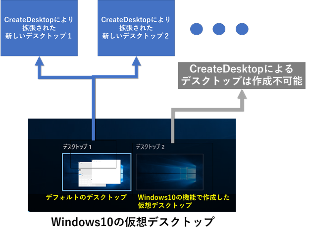 なお、筆者の検証の結果、Windows10におけるデフォルトデスクトップ(デスクトップ1)以外の仮想デスクトップからはCreateDesktopによるデスクトップは作成できないことがわかりました。