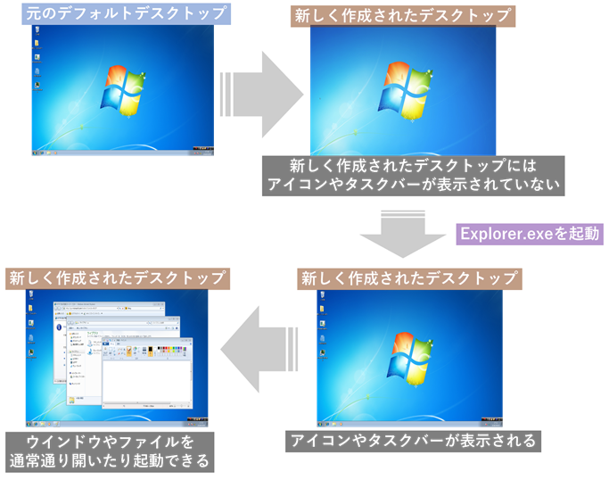 そして、この仕組みを利用してユーザーには見ることのできない隠されたデスクトップを作成し悪用する脅威が存在します。