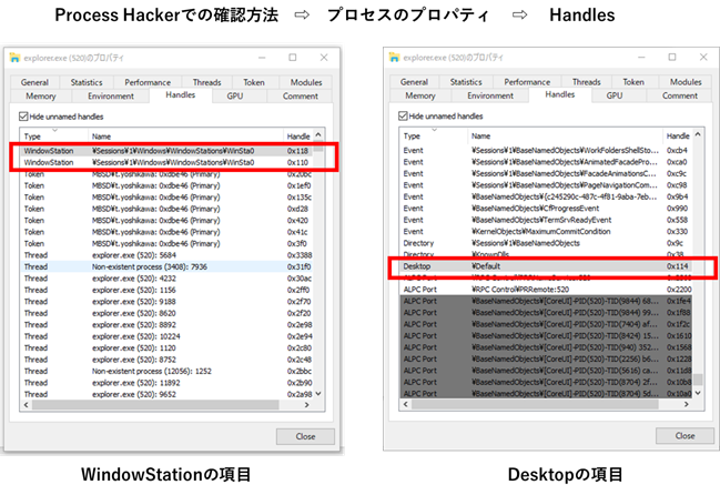 図 20 ProcessHackerを利用したWindowStation名とDesktop名の確認方法