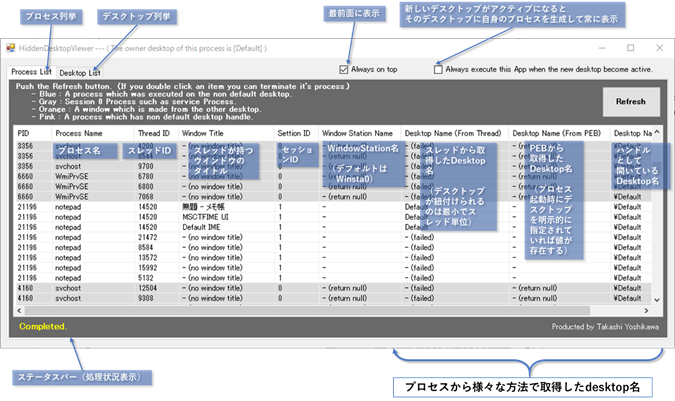 「Process List」タブの状態で「Refresh」ボタンを押すと、現在起動中のプロセス一覧と各プロセスに紐づくデスクトップ情報等の分析結果が一覧で表示されます。