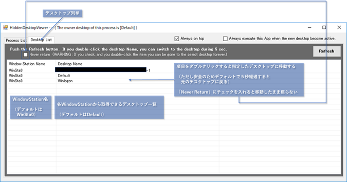 図 22 「HiddenDesktopViewer」の画面説明(「Desktop List」タブ)
