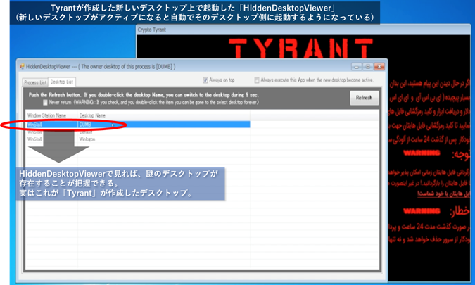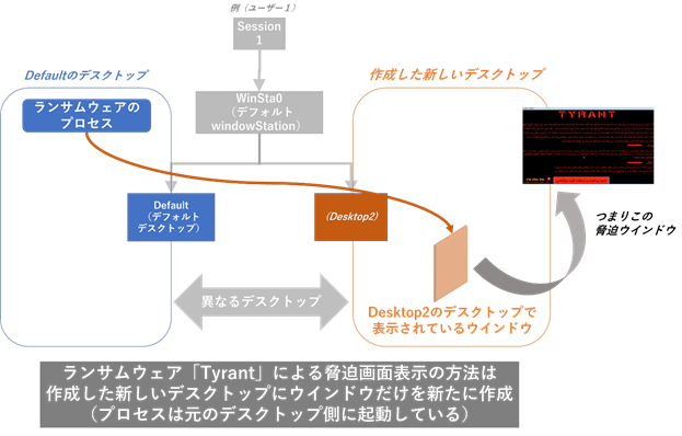 なおこの際、「Tyrant」の本体プロセスは元のデフォルトデスクトップ側に存在し、上図の脅迫画面は「Tyrant」の本体プロセスから作成された「ウインドウ」となります。