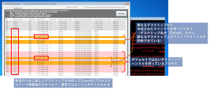 - オレンジ:感染後に起動したTyrantの脅迫ウインドウ・スレッド(強調理由: PEB(プロセス生成時の情報)がDefaultのデスクトップになっているにもかかわらず、別のデスクトップ「DUMB」側で起動しているHiddenDesktopViewerツールでWindow Titleが取得できている=つまりウインドウを異なるデスクトップをまたいで作成している)