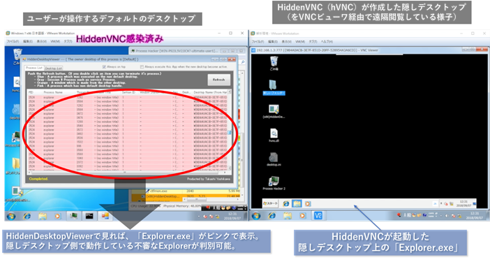 図 27 HiddenVNC(hVNC)が隠しデスクトップ側で起動した不審なExplorer.exeをあぶり出す様子