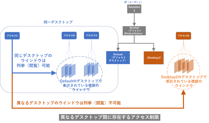 図 3 異なるデスクトップ間ではウインドウの列挙ができないという制限が存在