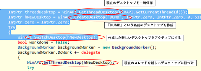 まず、GetThreadDesktopというWin32APIを用いて、現在のデスクトップに関する設定情報を一時的に保存(バックアップ)します。つぎに、CreateDesktopを用いて、新しいデスクトップを作成します。これだけではまだ既存のデスクトップの裏で新しいデスクトップが作成されただけなので、SwitchDesktopで新しく作成したデスクトップをアクティブにし、SetThreadDesktopで現在のプログラムのスレッドと新規作成したデスクトップを関連付けします。