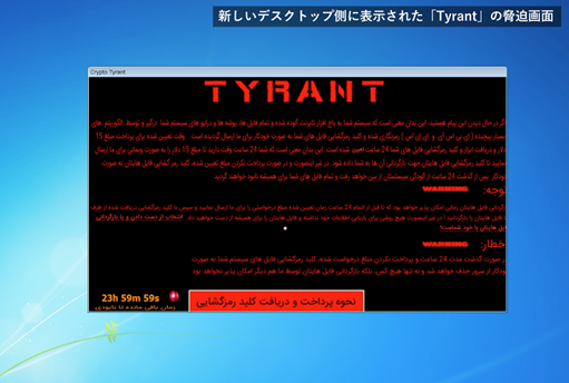 「Tyrant」は実行されるとすぐに新しいデスクトップを作成してそちら側にデスクトップを切り替え、脅迫ウインドウを表示させます。