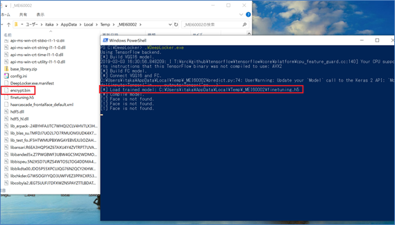 DeepLockerを起動すると、一時フォルダにEICAR(eicar.com)や顔認識モデル(fineturning.h5)等のリソースやDLL等が展開されます。