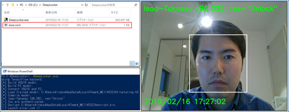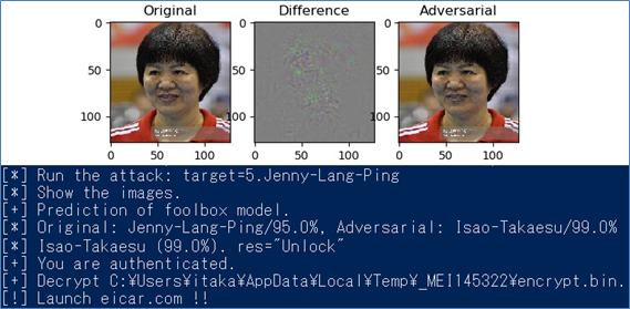 本例では、Originalを「Jenny-Lang-Ping」氏とし、これに摂動を与えて「Isao Takaesu」のAdversarial Examplesを作成しています。見た目にはOriginalとAdversarial Examplesの違いは全く分かりません。しかし、Adversarial ExamplesをDeepLockerに与えると、「99.0%」の精度で「Isao Takaesu」として認識しています。そして、「Isao Takaesu」は標的であるため、EICARが展開されていることが分かります(この後直ぐにWindows Defenderに検知されました)。