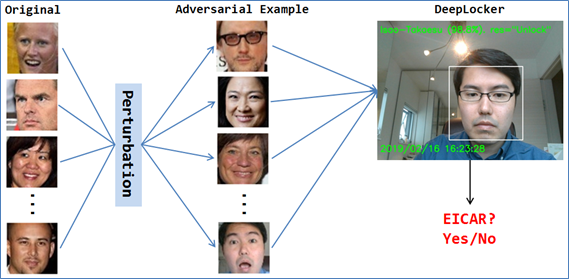 実は、DeepLockerに内蔵されている顔認識モデル(=Deep Learning)は、Adversarial Examplesと呼ばれる特殊なデータに弱いことが知られています。このAdversarial Examplesは、認識モデルの判断を意図した方向に誤らせることができる特性を持ちます。