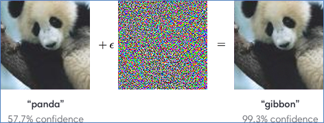 元画像に(真ん中の)摂動を与えて作成したAdversarial Examplesが右の画像です。人間には相変わらずパンダに見えますが、認識モデルは「Gibbon(テナガザル)」として認識します。