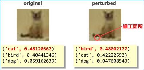 元画像の任意の1ピクセルを白く塗り潰して作成したAdversarial Examplesが右の画像です。人間には相変わらず猫に見えますが、認識モデルは「鳥」として認識します。