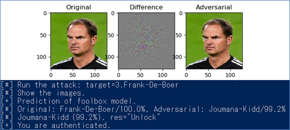 本例では、Originalを「Frank-De-Boer氏」とし、これに摂動を与えて「Joumana-Kidd氏」のAdversarial Examplesを作成しています。見た目にはOriginalとAdversarial Examplesの違いは全く分かりません。しかし、Adversarial ExamplesをDeepLockerに与えると、「99.2%」の精度で「Joumana-Kidd」氏として認識しています。そして、「Joumana-Kidd」氏は標的ではないため、EICARは展開されません。